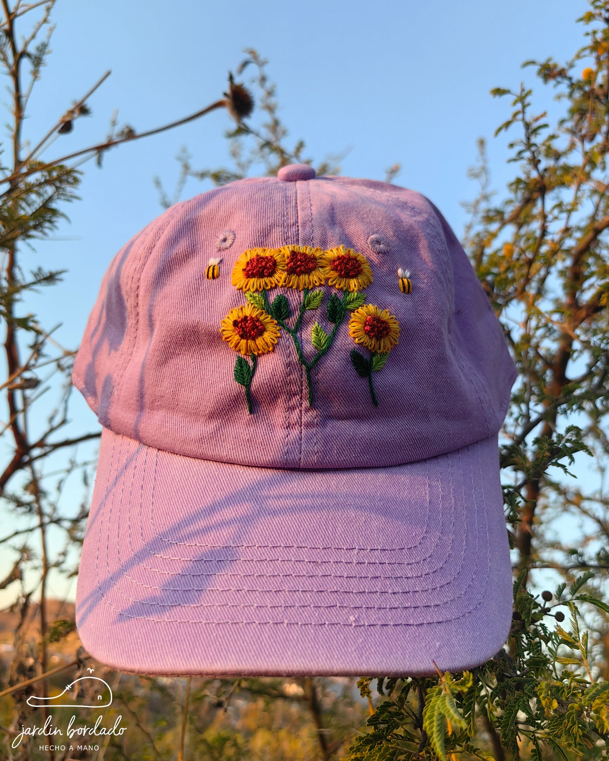 Gorra con girasoles y abejitas bordada a mano con hilos mouliné DMC